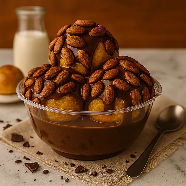 Sütlü Profiterol Topları Üzerine Kavrulmuş Antep Fıstığı Ve Özel Çikolata Sos İlavesi (Katkı Maddesi İçermez.)
