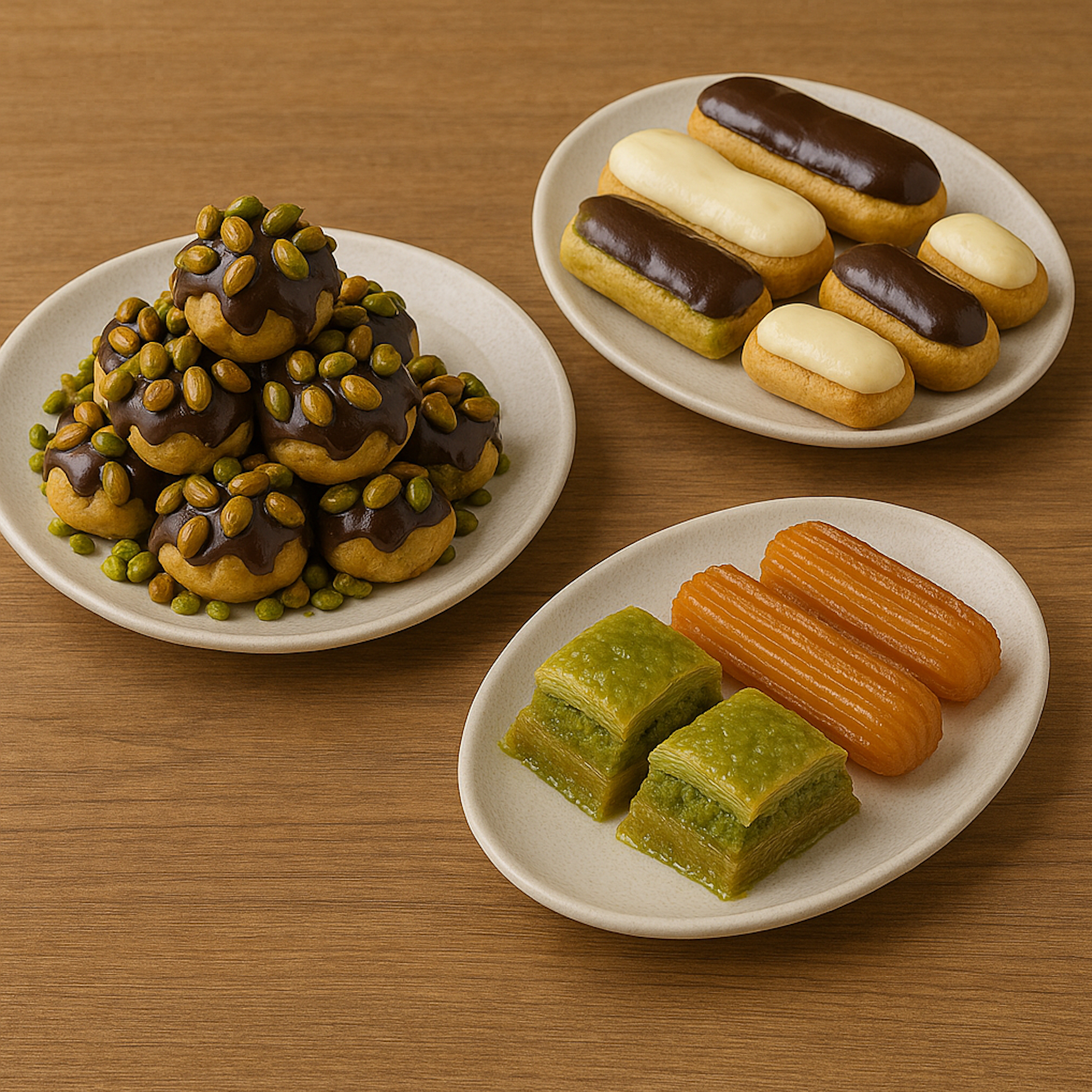 2 Adet Fıstıklı Profiterol (1 Kg) + 2 Adet Antep Fıstıklı Baklava (1 Kg) + 2 Adet Karışık Ekler (1 Kg) + 2 Adet Karışık Tulumba Tatlısı (1 Kg)