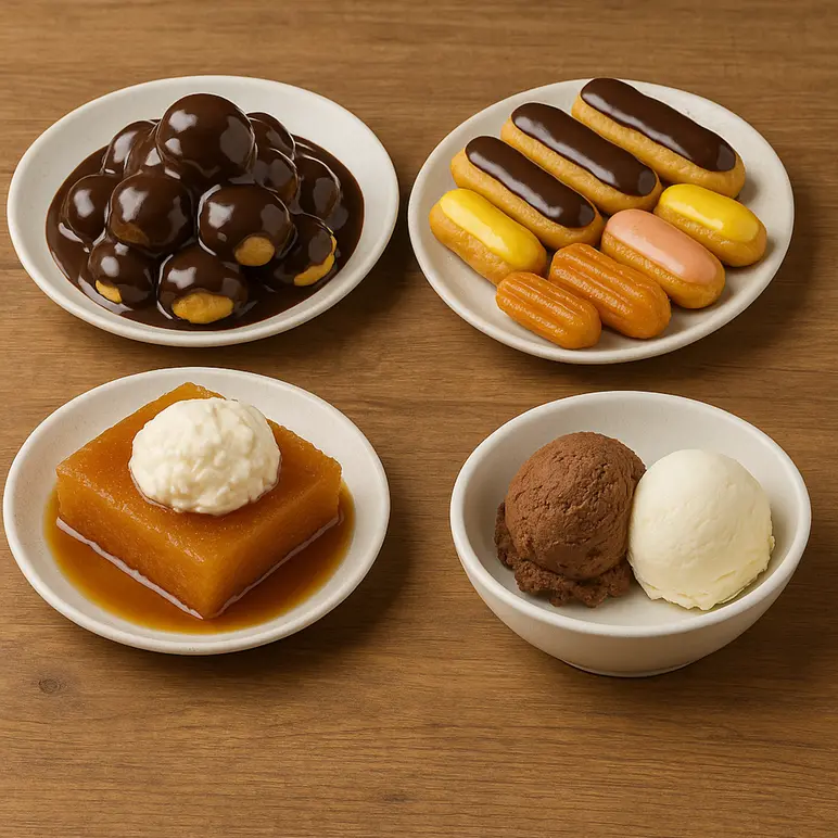 Fıstıklı Profiterol (250 Gr) + Karışık Ekler (250 Gr) + Kaymaklı Ekmek Kadayıfı (250 Gr) + Rumeli Tulumba Tatlıısı (250 Gr) + Karışık Dondurma (250 Gr)