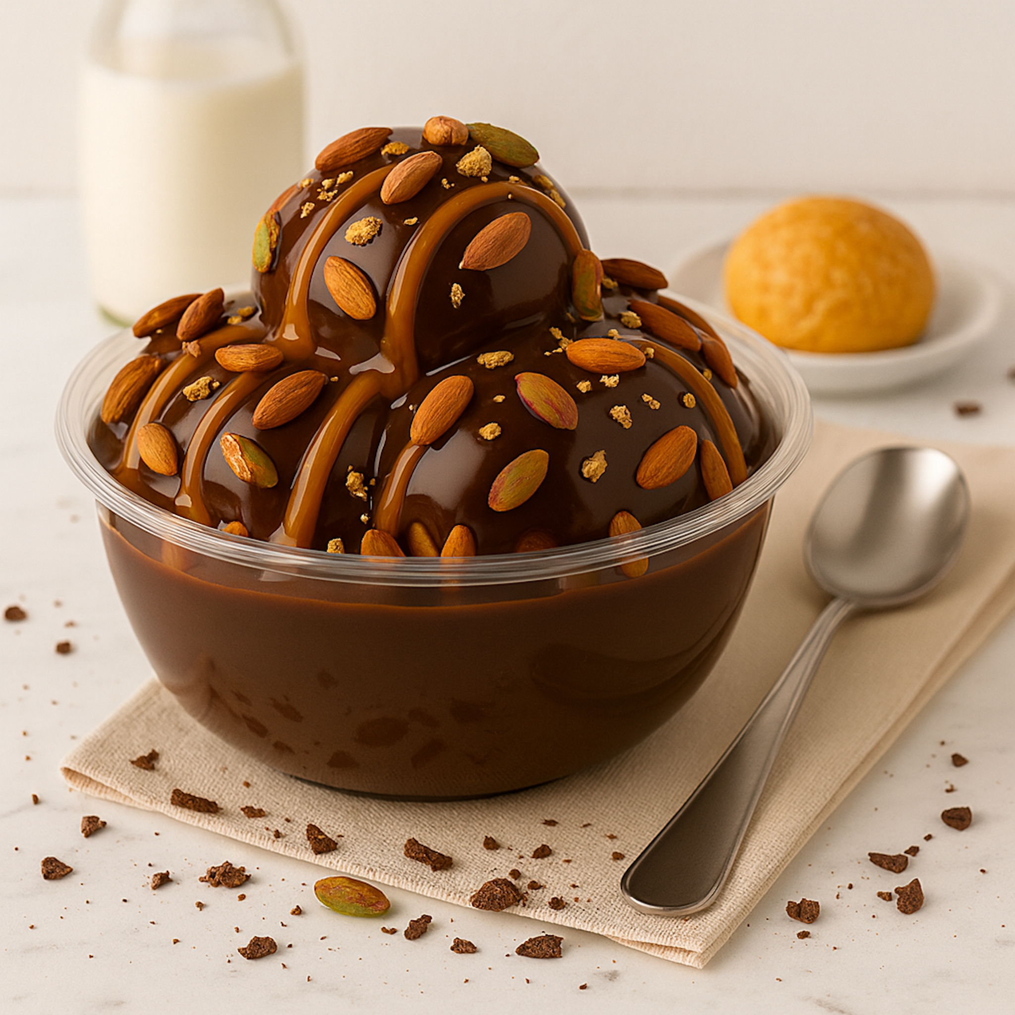 2 Top Profiterol Üzerine Karamel, Çikolata Sos, Antep Fıstığı